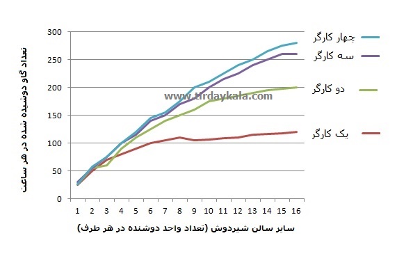 در نمودار بالا، هر منحنی بیانگر تعداد گاوی است که در هر ساعت توسط 1 تا 4 کارگر دوشیده می شود. توجه نمایید که نسبت ها بسته به تعداد واحد دوشنده (1 تا 16 واحد) متفاوت است.
