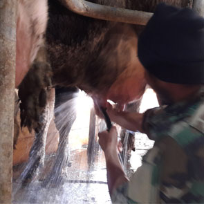1- شستشوی سرپستانها: پس از ورود دام به چال شیردوشی، سرپستانها را با آب ولرم بشویید یا با حوله مرطوب تمیز کنید تا هرگونه آلودگی از جمله کود از سطح پستانها حذف شود. توجه داشته باشید که شستشوی پستان باید با فشار کم آب انجام شود تا فقط سرپستانها مرطوب شوند و از خیس شدن سطح پستان و موهای آن جلوگیری شود. خیس شدن پستانها میتواند باعث ورود آب آلوده به داخل لاینر و بروز مشکلاتی همچون آلودگی شیر و بیماریهای پستانی شود.
