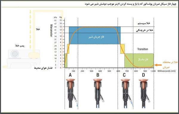 با گرفتن گراف ماهانه از پولساتورها، از عملکرد صحیح آن ها مطمئن شوید. این امر سبب می شود که تنظیمات پولساتور برای هر چهار فاز ضربان یکنواخت باشد. به صورت کلی فاز اول و دوم بیانگر زمان باز بودن لاینر و فاز سوم و چهارم نشانگر مدت زمان بسته بودن لاینرهاست.