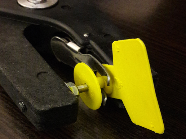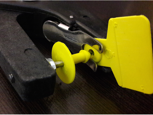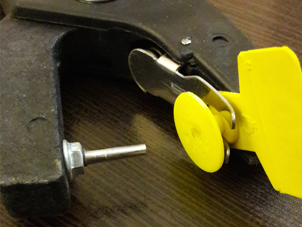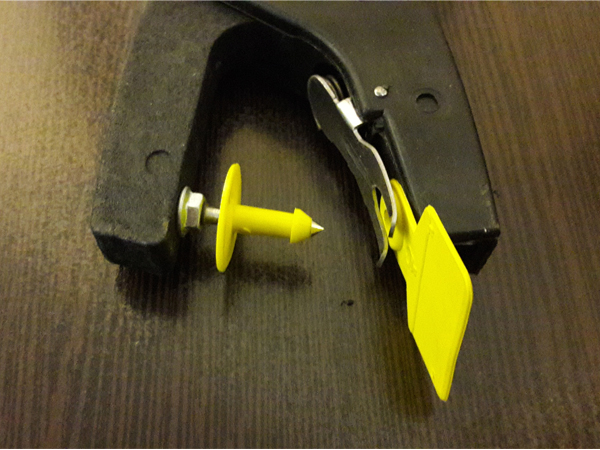 سپس پلاک گوش را بر روی قسمت دیگر پنس جایگذاری کنید و با استفاده از فنر تعبیه شده روی پنس، پلاک را مهار کنید. در این حالت در صورت تکان خوردن پنس، پلاک و میخ نمی بایست از پنس جدا شوند. اکنون با چند بار باز و بسته کردن پنس مطمئن شوید که میخ به درستی در مادگی فرو می رود.